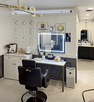 전체적인 컨셉은 화이트&우드 톤을 기본으로, 포인트 컬러를 일부 가구와 소품에 반영했습니다. 밝고 따뜻한 분위기를 강조하면서도, 관리실·시술실의 프라이버시 확보를 중요하게 고려했습니다.