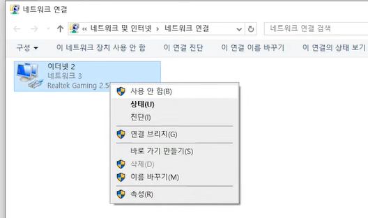클릭후 이더넷을 마우스 우클릭후 사용안함 클릭후