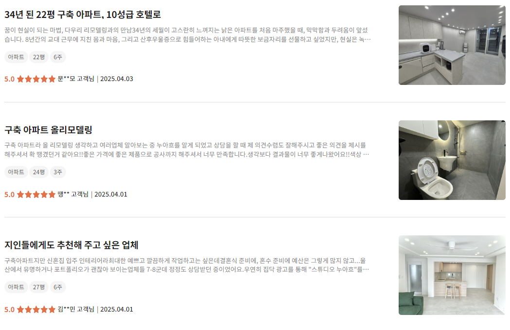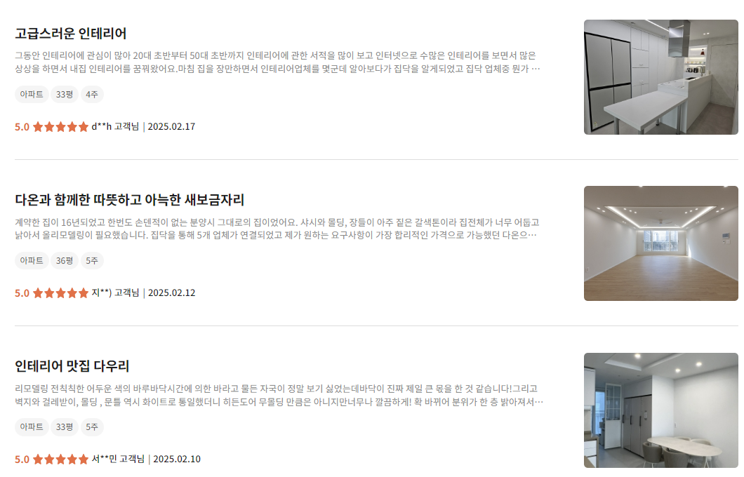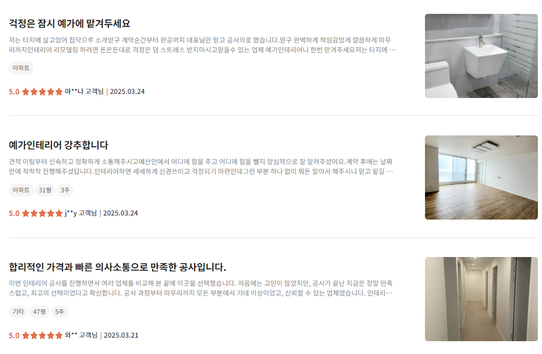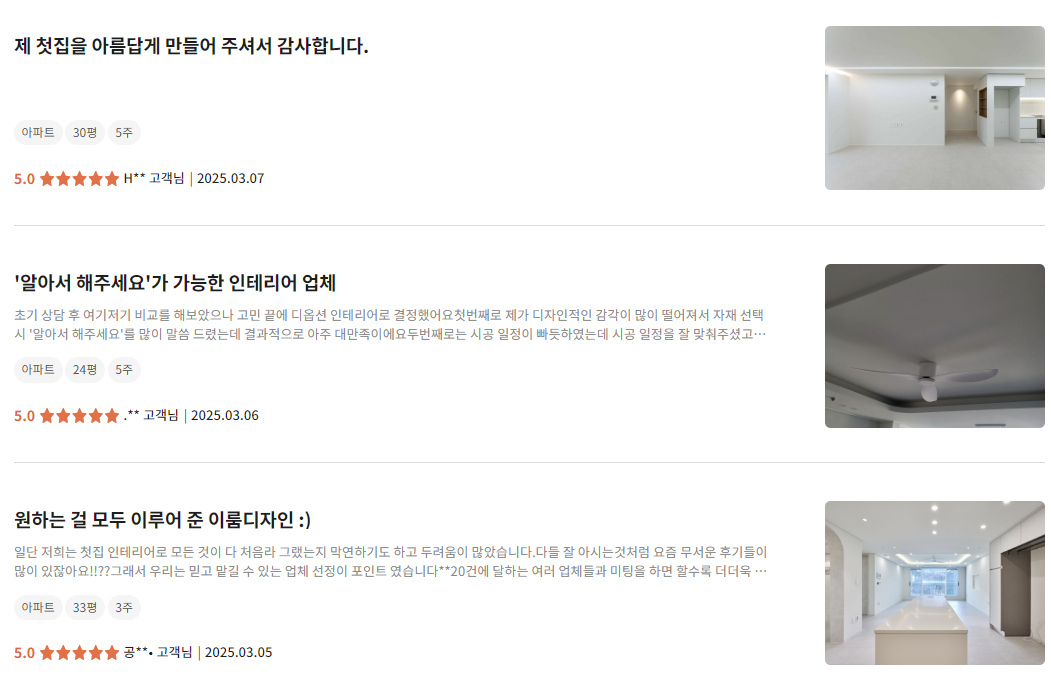 - 평균 2~3일 내 실측 → 5곳 견적 비교