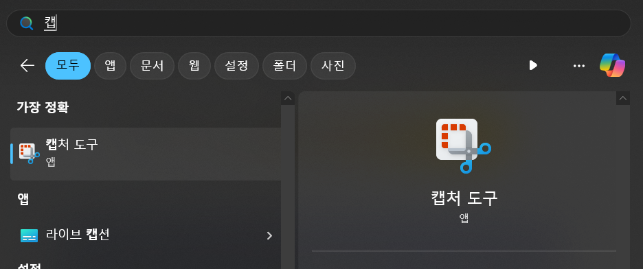 (저는 "캡"이라고 검색해도 나왔어요!) 이후 캡처도구를 클릭하면
