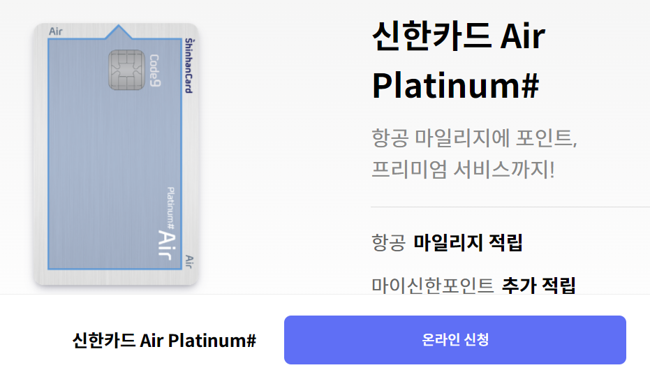 해외 여행을 자주 가시는 분이라면, 신한카드 Air Platinum을 추천드려요. 항공 마일리지 적립은 물론, 공항 라운지 무료 이용 혜택까지 제공합니다.